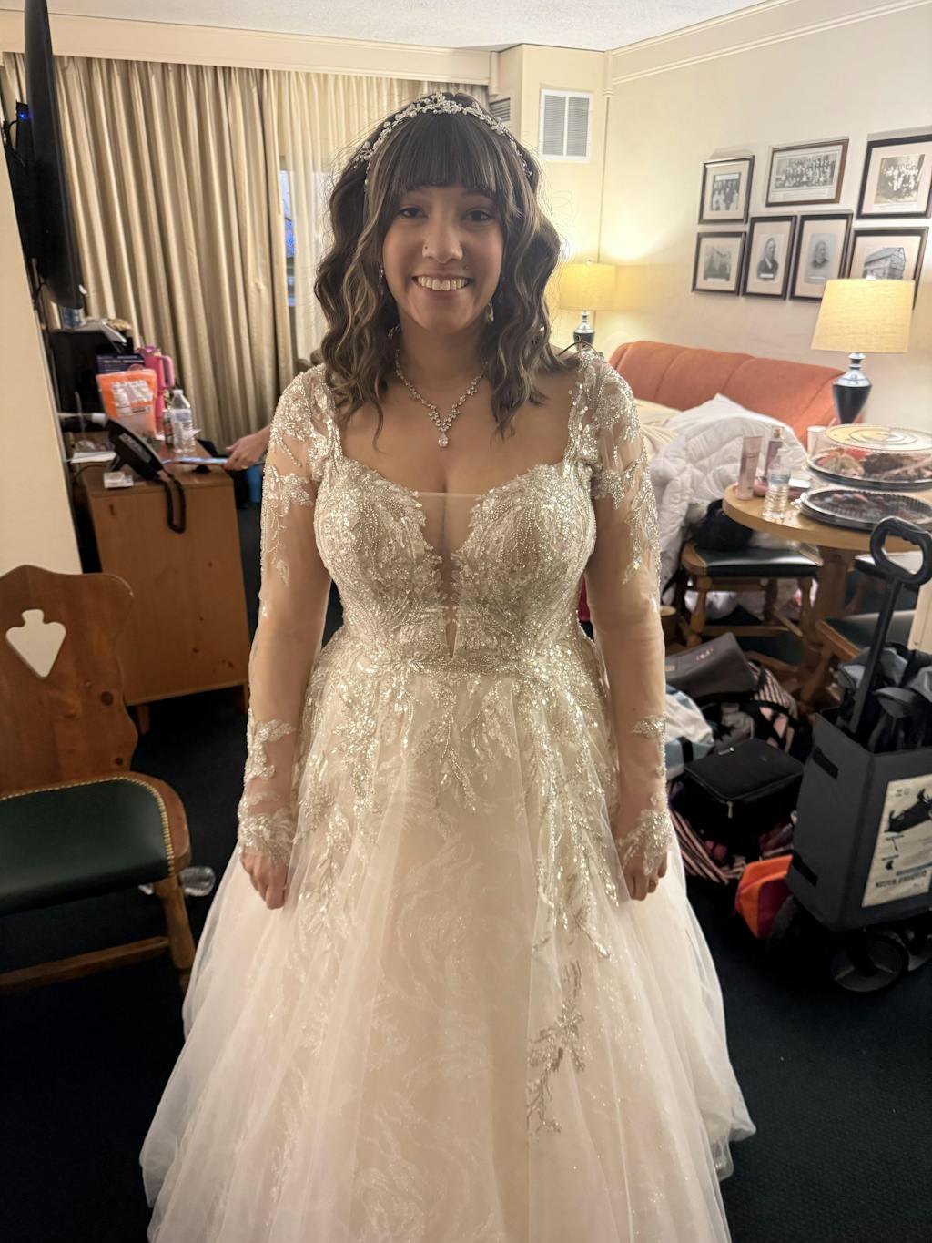 Match metal to your dress details (silver for cooler beading, gold/rose gold for warm tones). Pick an earring length that complements your neckline—studs for high necks, drops for V or off-shoulder. A coordinated set keeps everything balanced in photos.